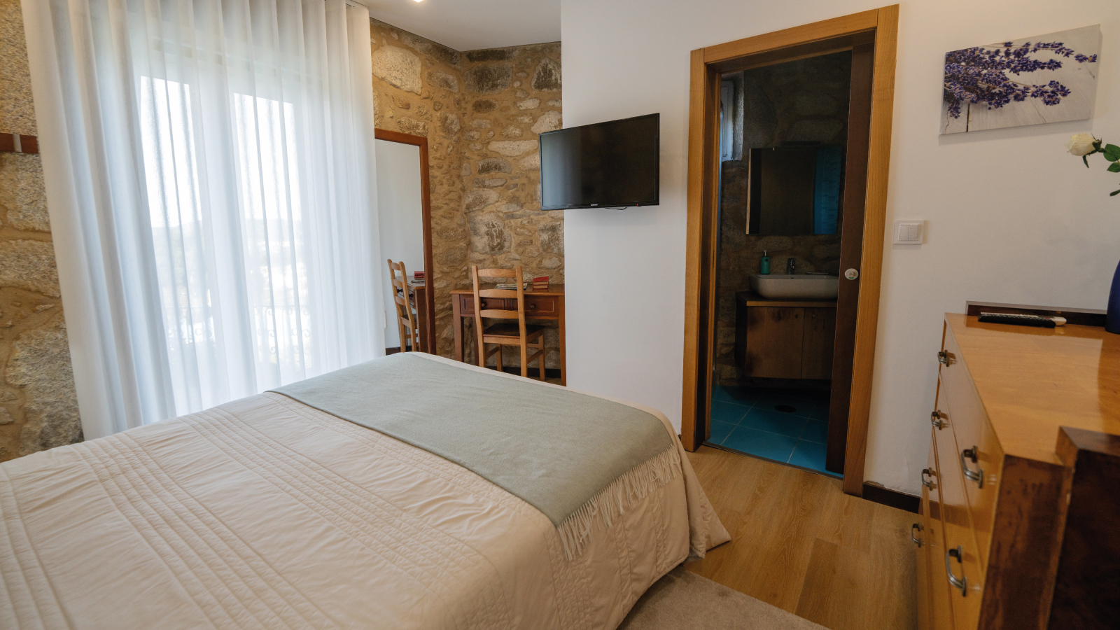 Tal como a casta branca Loureiro, este quarto de casal é igualmente de alta qualidade e está preparado com todos os confortos para qualquer altura do ano. Os seus tons trazem-lhe a calma que necessita para desfrutar deste quarto equipado com televisão por cabo, wi-fi, ar condicionado e quarto de banho privativo.